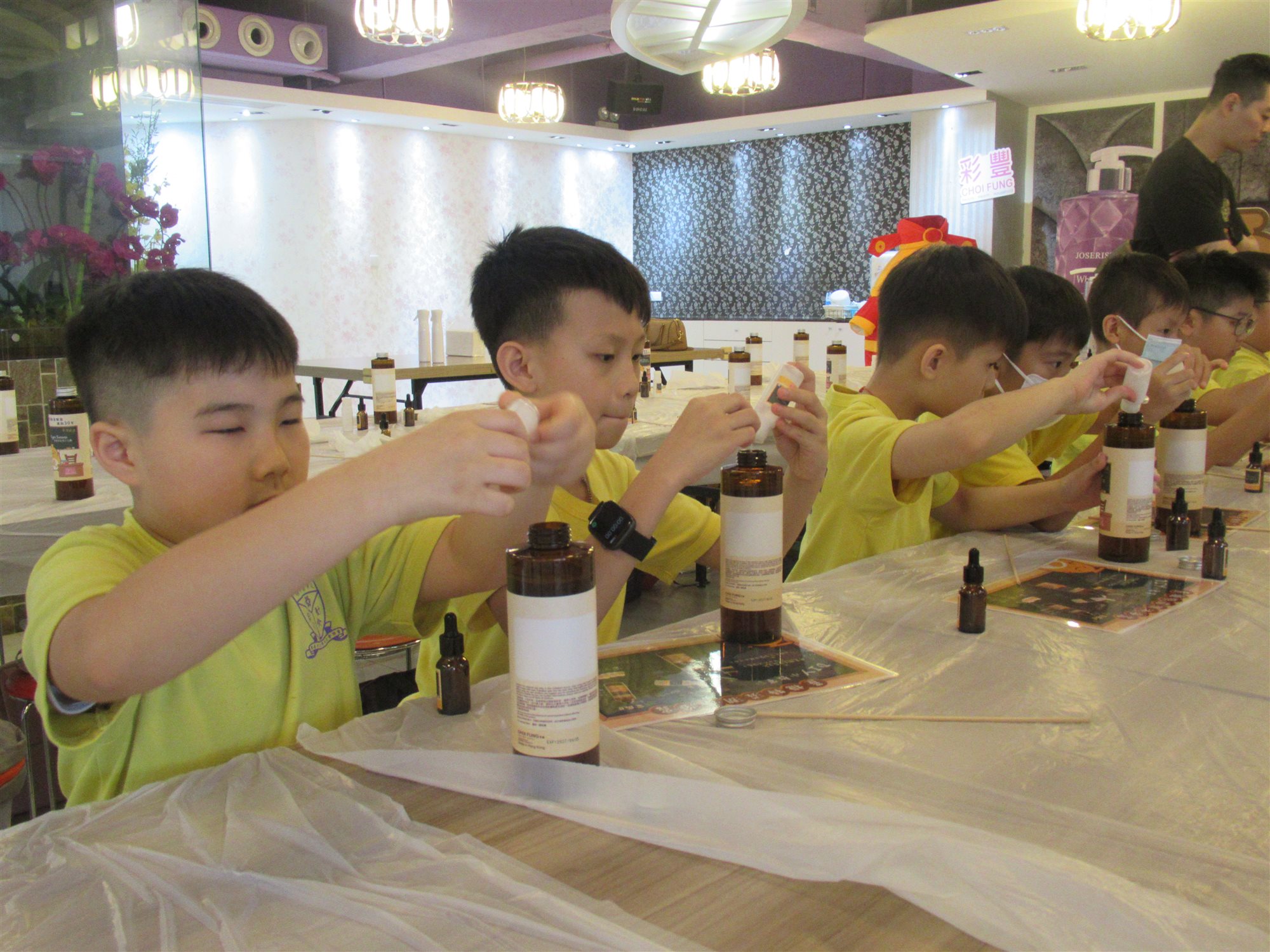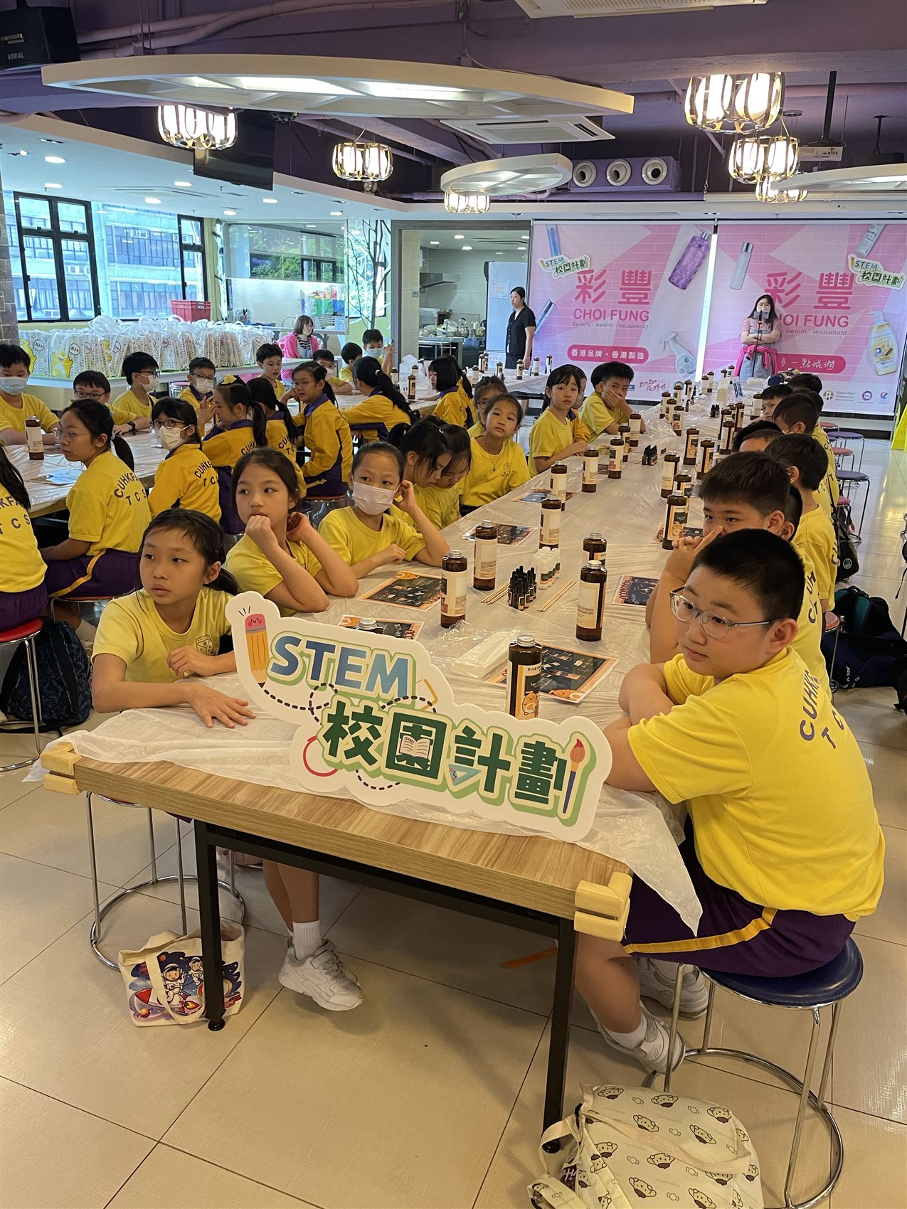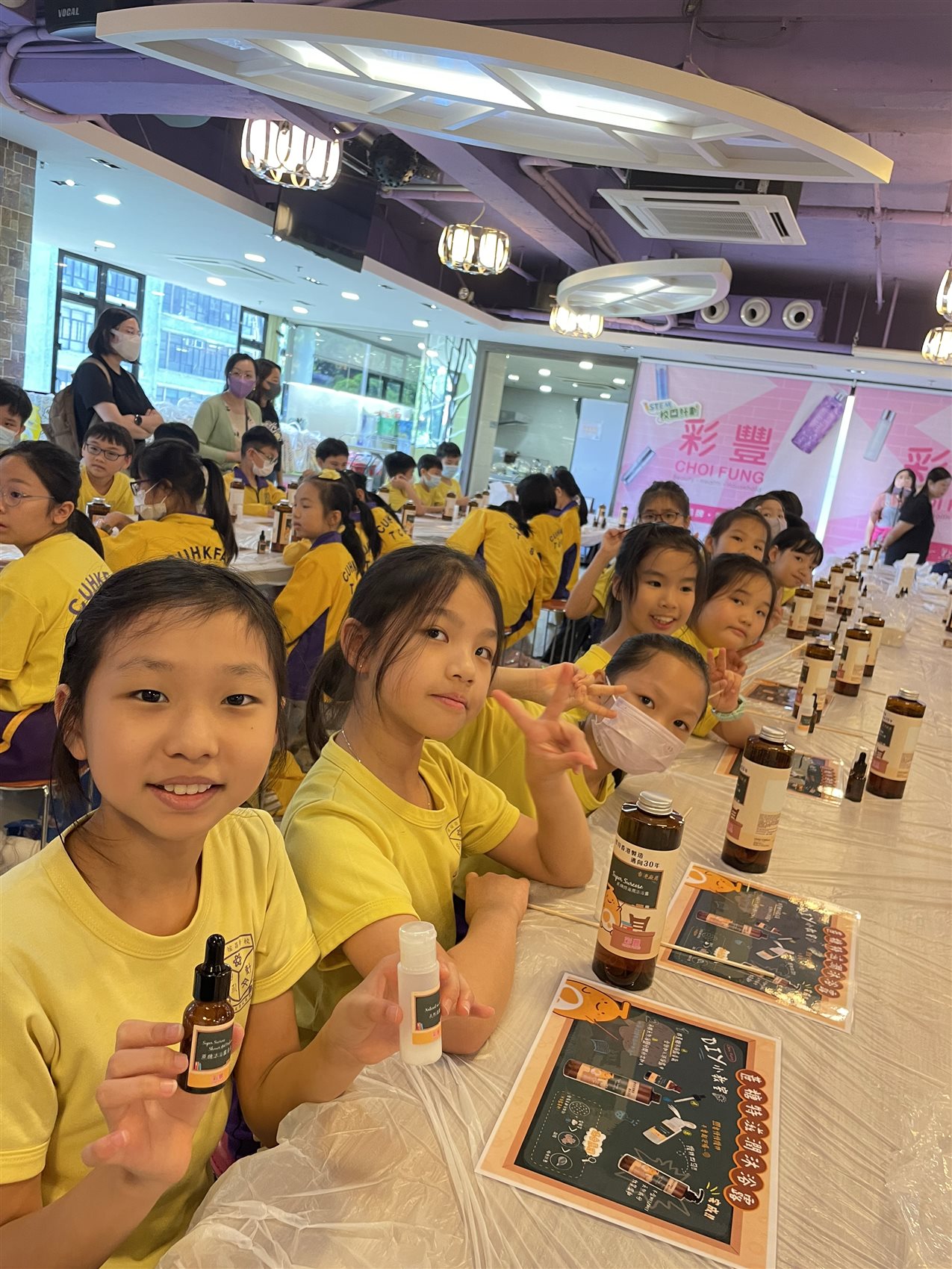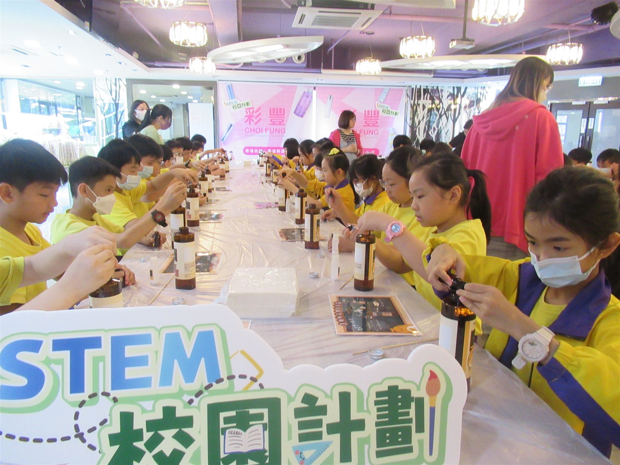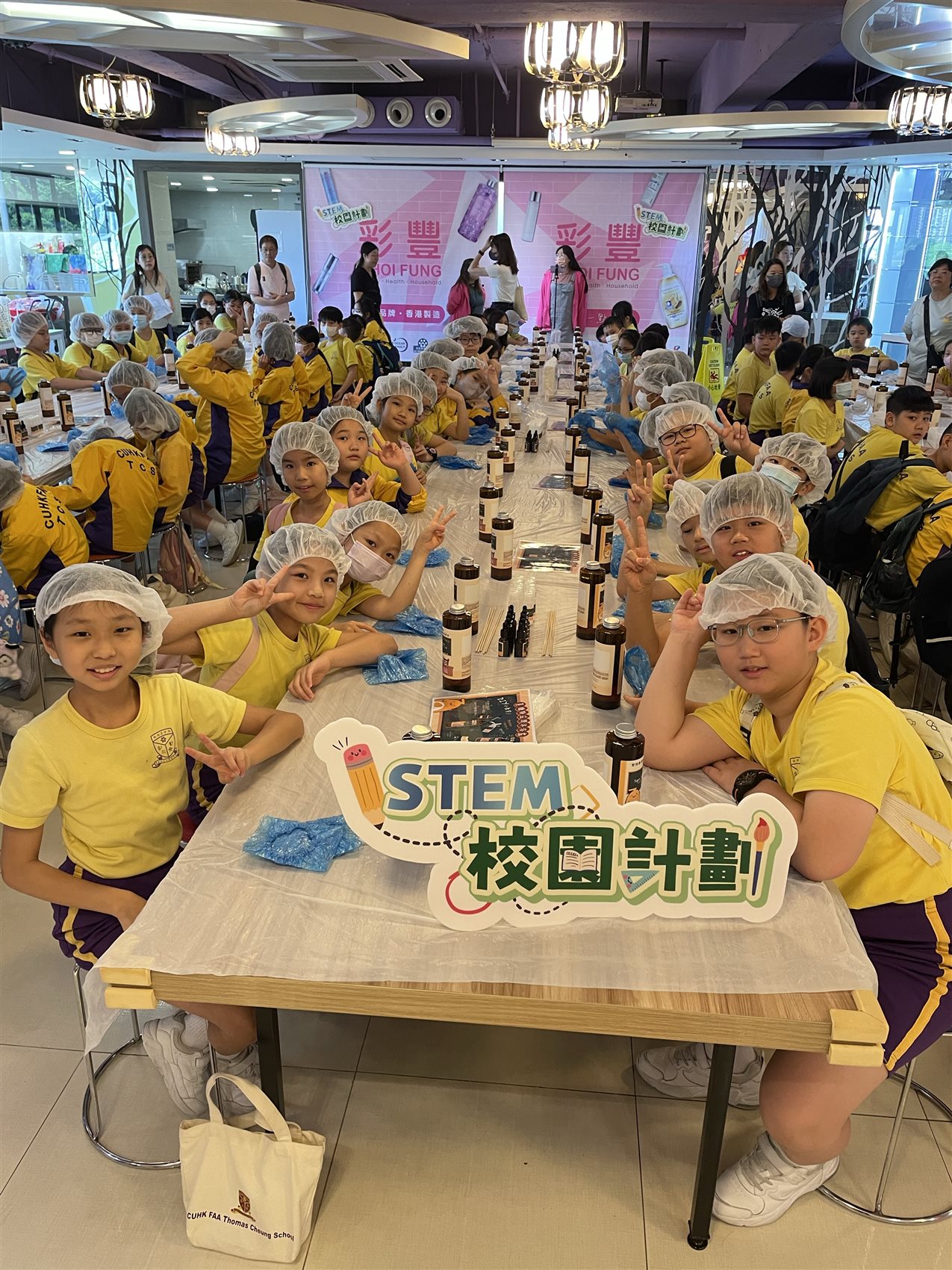 本校於7月10日(星期三)為全體小四舉辦「學生活動日之彩豐行@STEAM生涯規劃體驗」。老師帶領小四全體同學到本地品牌「彩豐行」廠房認識香港品牌公司的創立歷程。學生在參訪過程中,能認識日常生活用品(如洗髮水)的製作過程及認識公司各範疇職位的職能。學生更運用STEAM科學原理,以工作坊形式製作獨一無二的產品,然後把親手製作的產品帶回家跟家人分享。