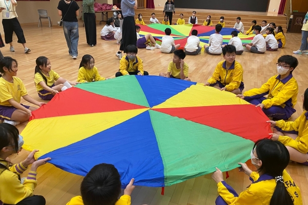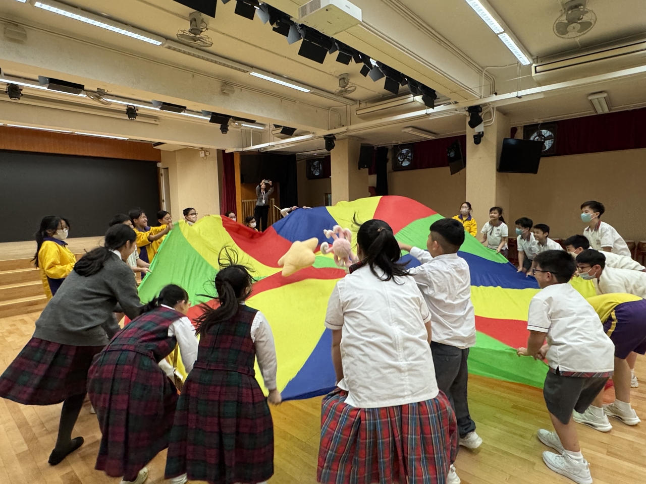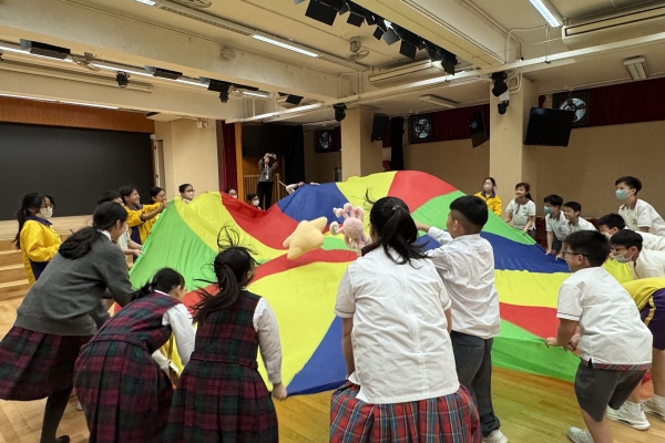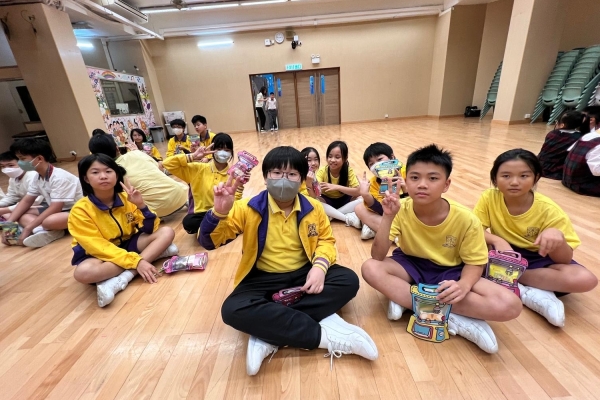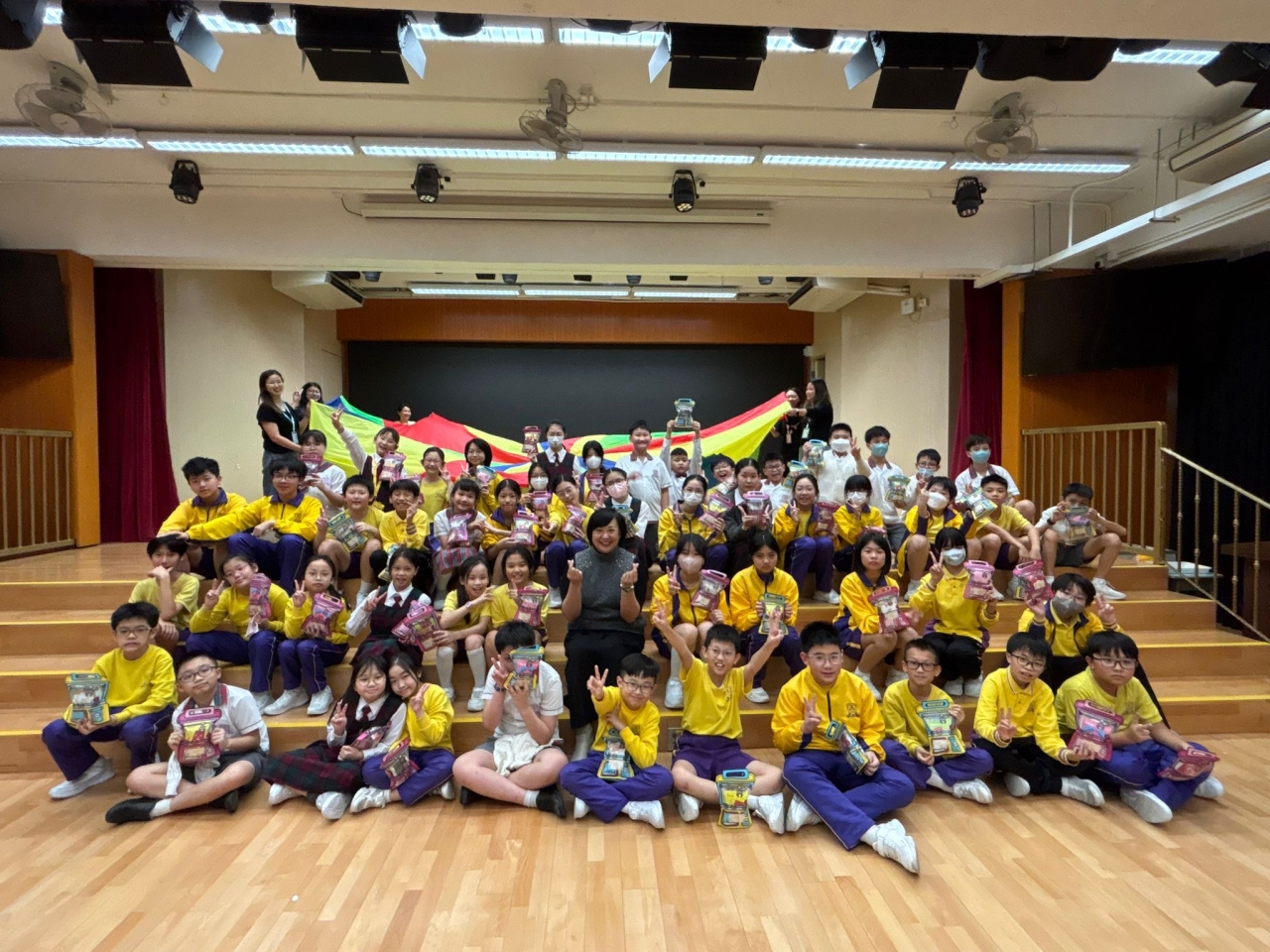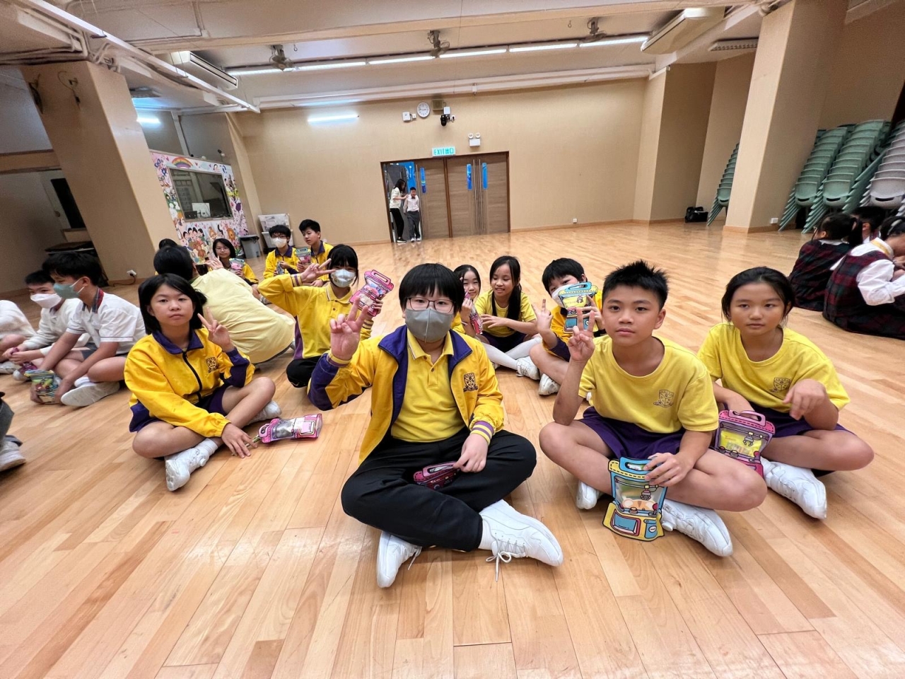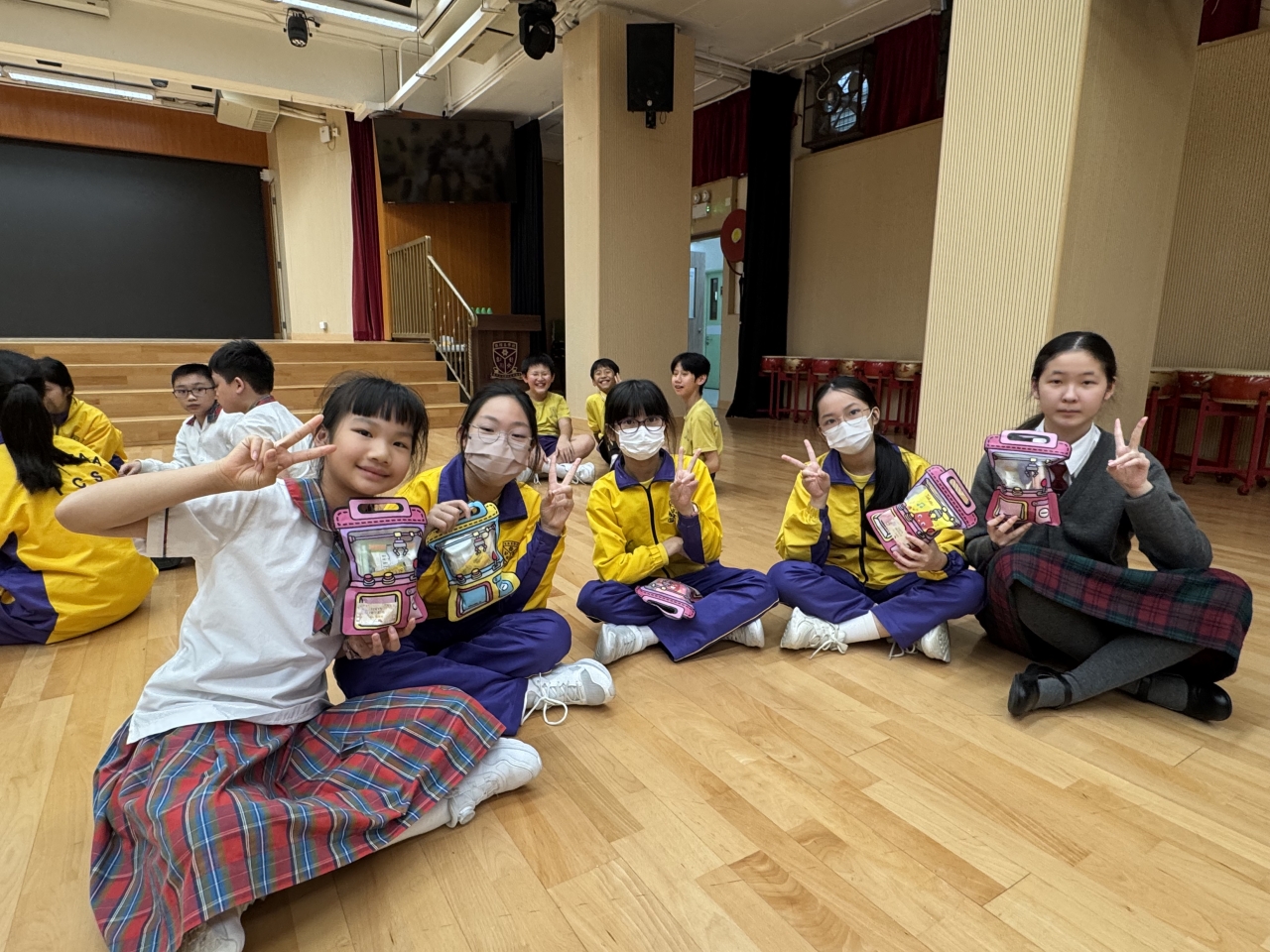 的學生於禮堂進行集體活動,氣氛熱烈。