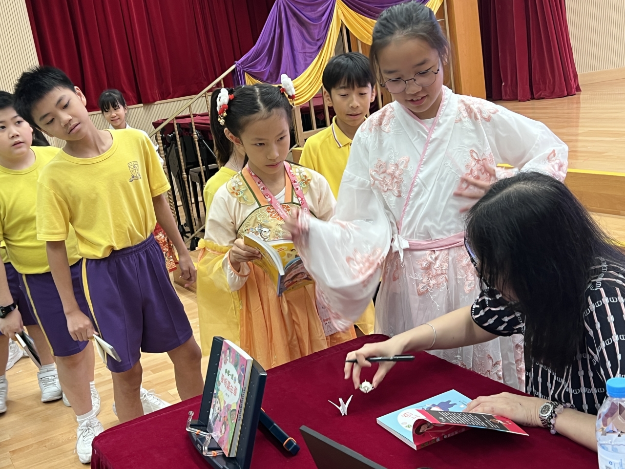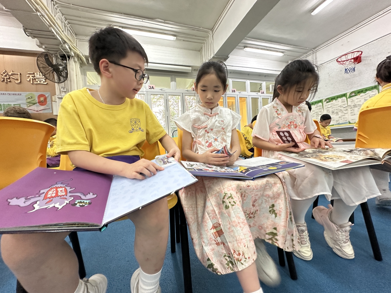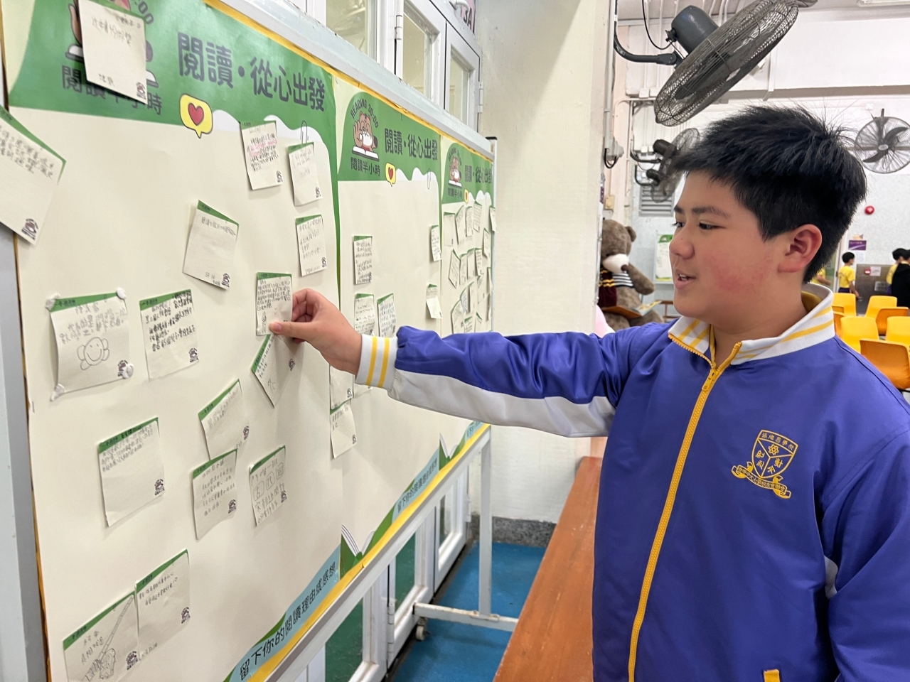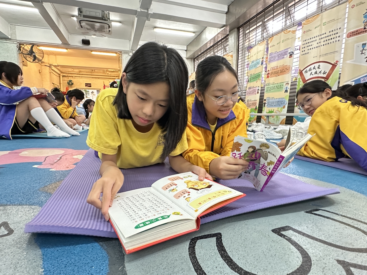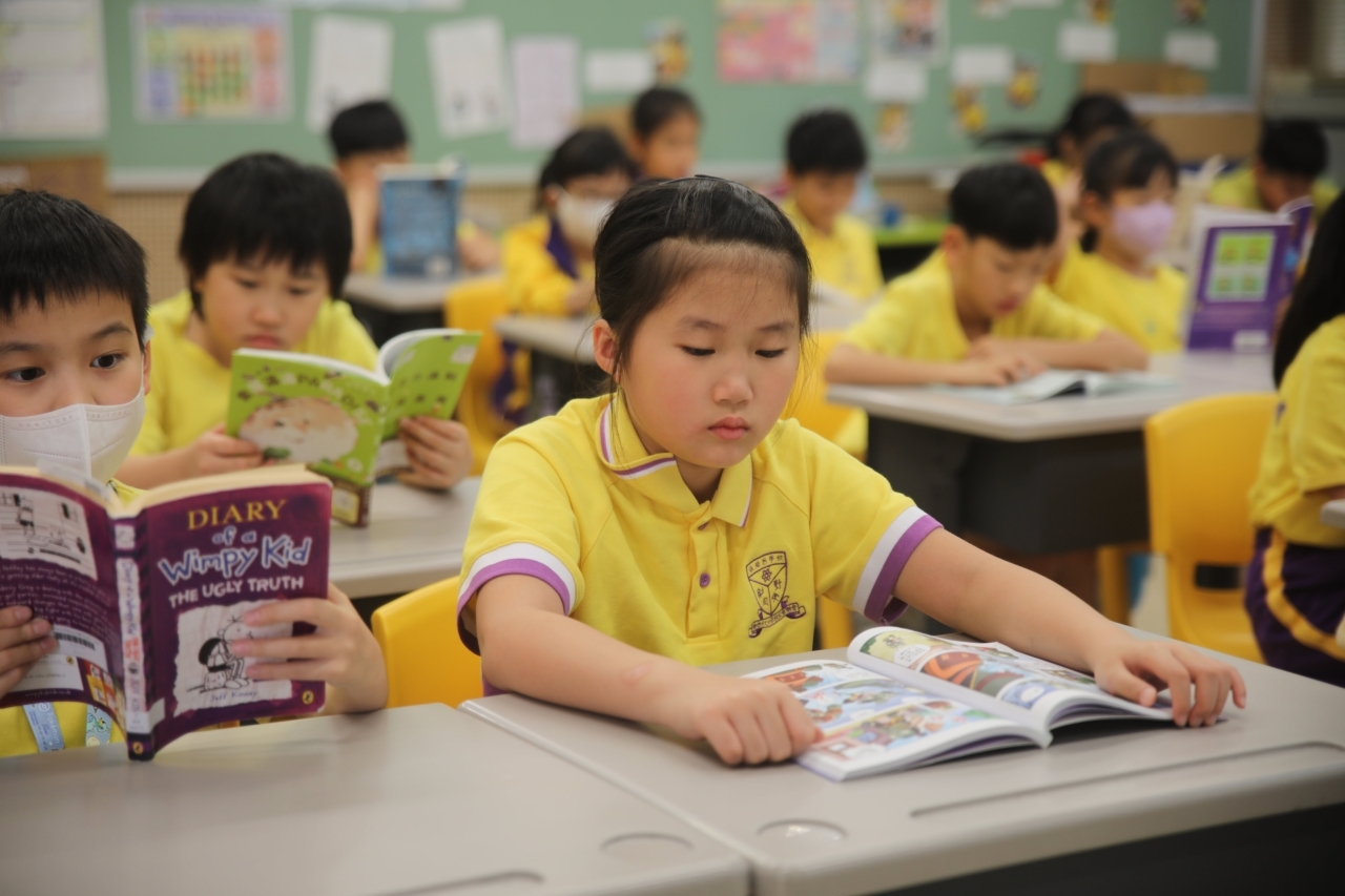 2026-04-28 閱讀半小時 同學們在早讀時段專心閱讀半小時,隨後在便利貼上寫下閱讀感想,再到雨操場張貼,和同學們分享閱讀的樂趣。 圖書大電視 學生們利用遊戲方式和同學分享書中事物,刺激又好玩。 漂書活動 早前,學校向家長們募捐圖書進行漂書活動,很多學生都在活動中尋得心頭好,將圖書帶回家閱讀。 攤位遊戲 配合《跟着皇帝遊故宮》的主題,學校準備了不同種類的攤位遊戲供學生們體驗,既有不同科目的遊戲,也有摺紙活動,活動多元化,學生們也玩得盡興。 閱讀講座 高年級邀請了《鬥嘴一班》的作者卓瑩姐姐到校為學生們分享創作心得,學生們聽得津津有味,講座後更設有作者簽書活動。低年級則邀請了新雅姐姐跟學生們分享《跟着皇帝遊故宮》的故事。