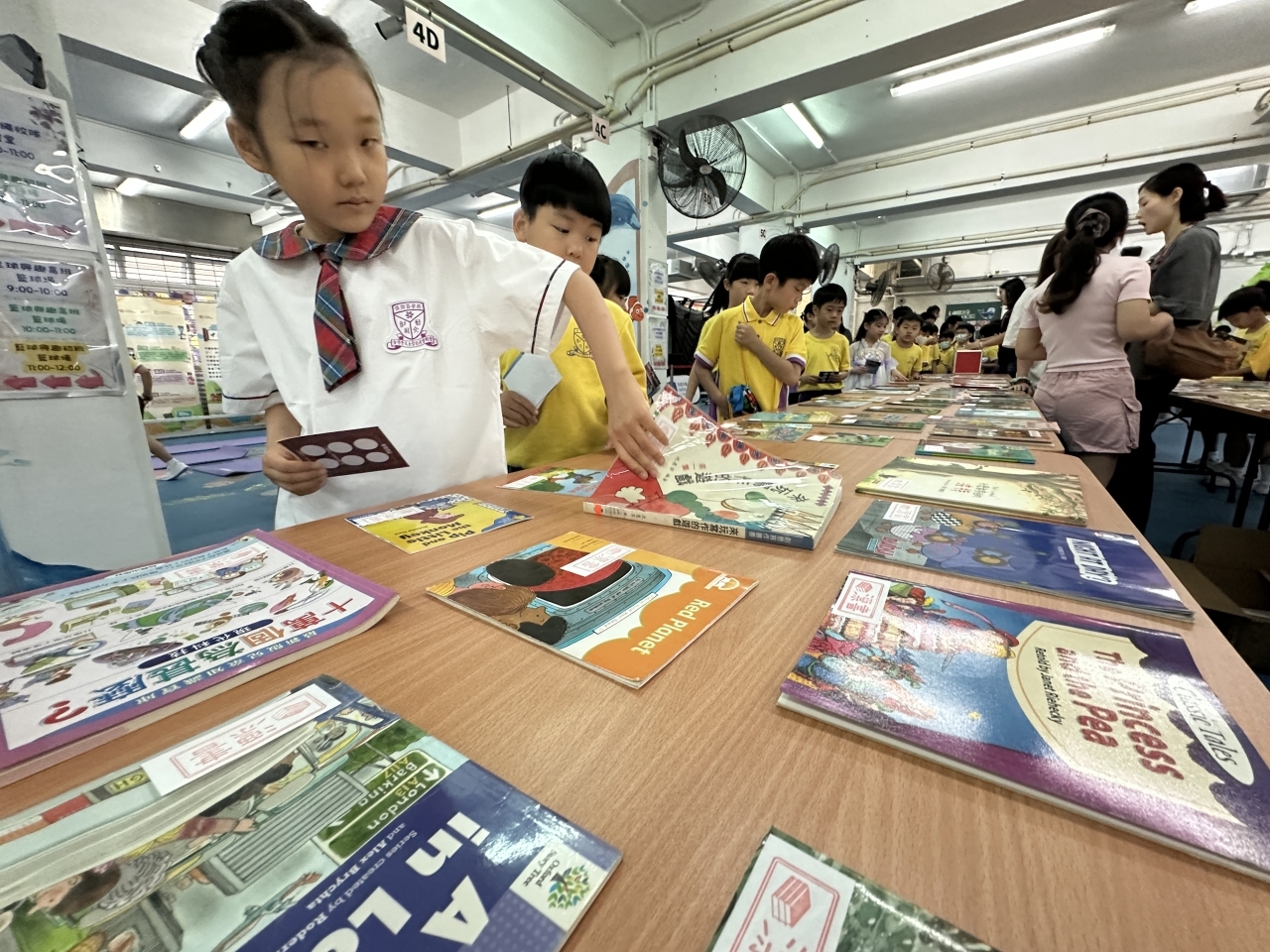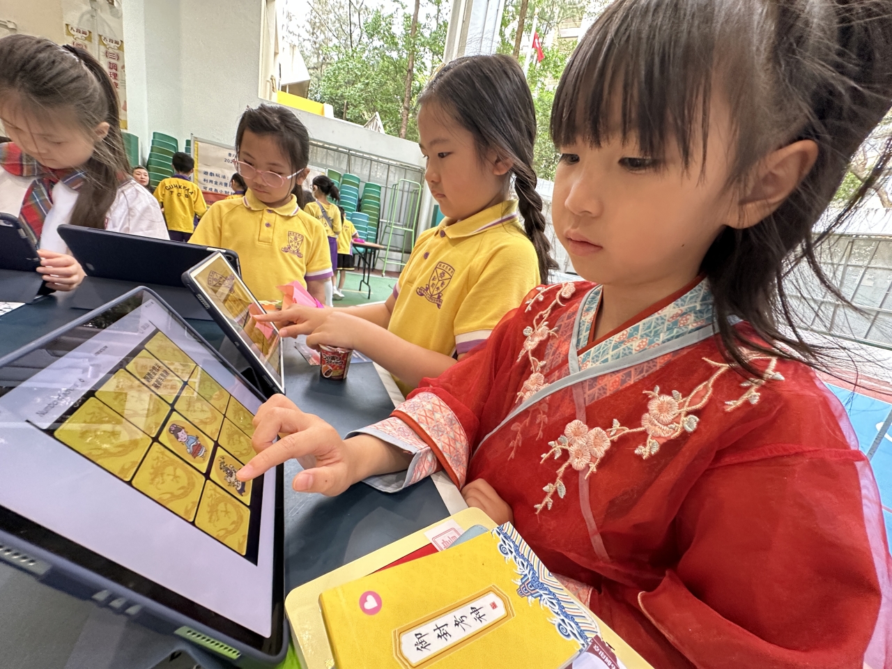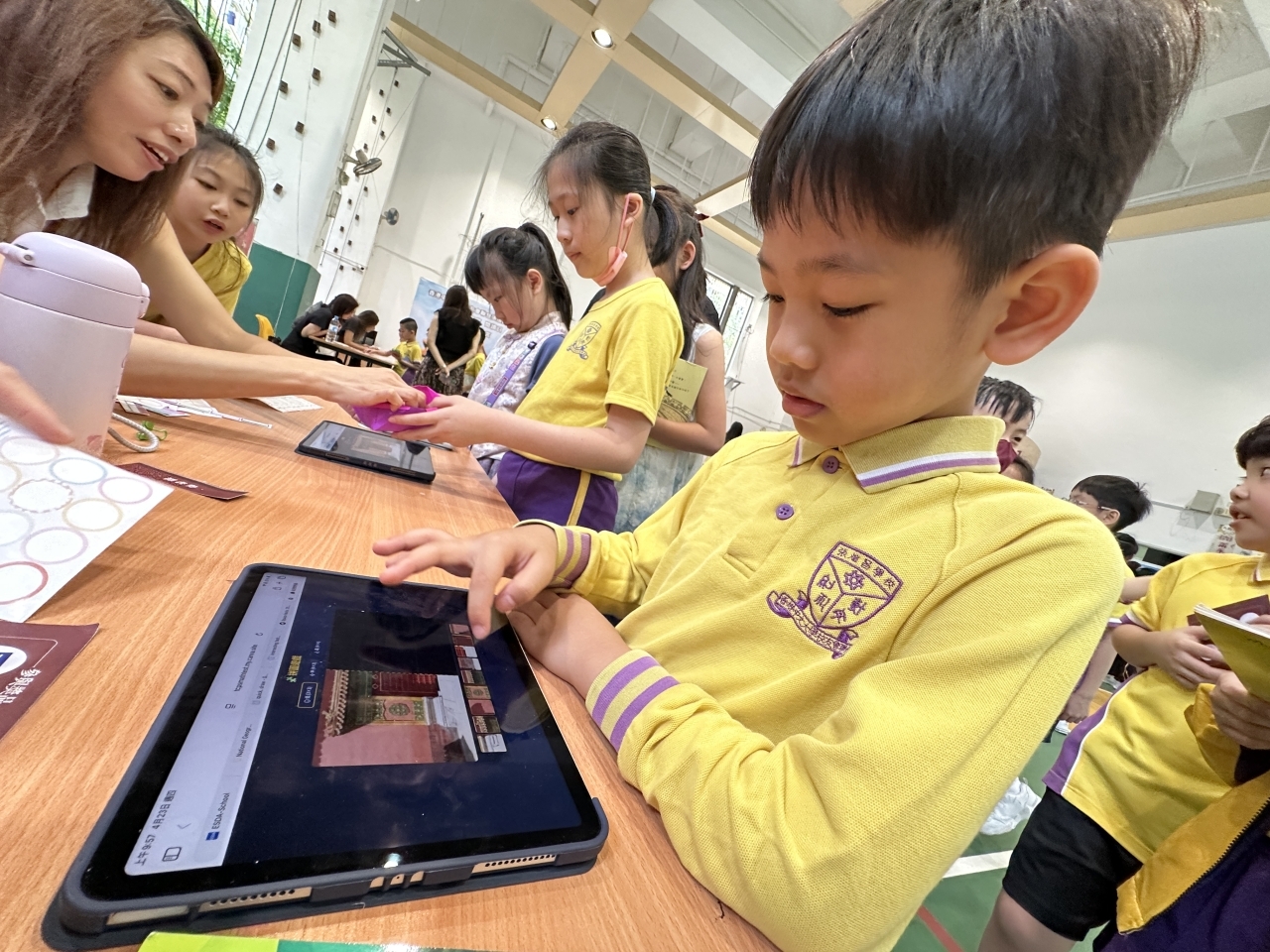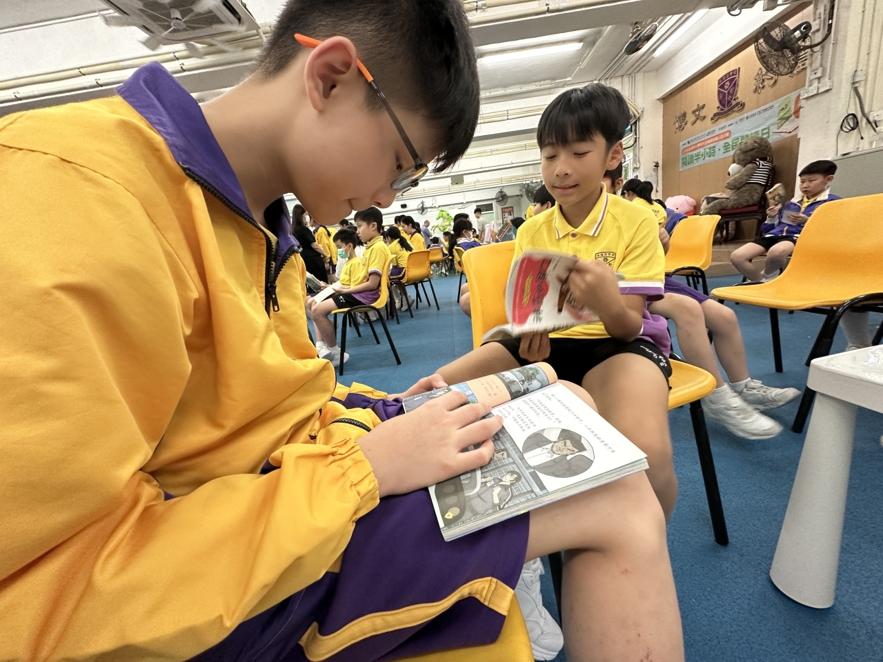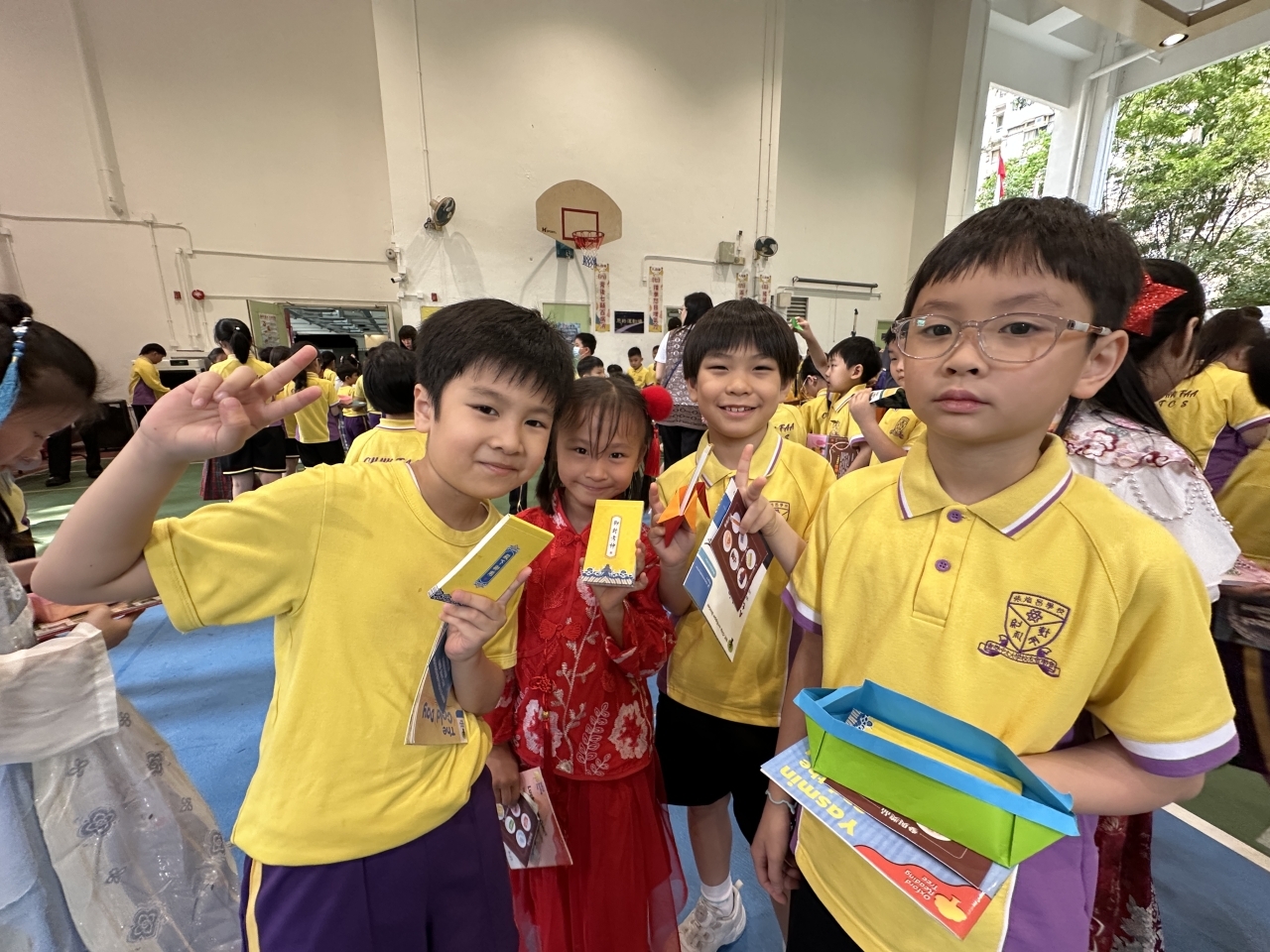 2026-04-28 閱讀半小時 同學們在早讀時段專心閱讀半小時,隨後在便利貼上寫下閱讀感想,再到雨操場張貼,和同學們分享閱讀的樂趣。 圖書大電視 學生們利用遊戲方式和同學分享書中事物,刺激又好玩。 漂書活動 早前,學校向家長們募捐圖書進行漂書活動,很多學生都在活動中尋得心頭好,將圖書帶回家閱讀。 攤位遊戲 配合《跟着皇帝遊故宮》的主題,學校準備了不同種類的攤位遊戲供學生們體驗,既有不同科目的遊戲,也有摺紙活動,活動多元化,學生們也玩得盡興。 閱讀講座 高年級邀請了《鬥嘴一班》的作者卓瑩姐姐到校為學生們分享創作心得,學生們聽得津津有味,講座後更設有作者簽書活動。低年級則邀請了新雅姐姐跟學生們分享《跟着皇帝遊故宮》的故事。