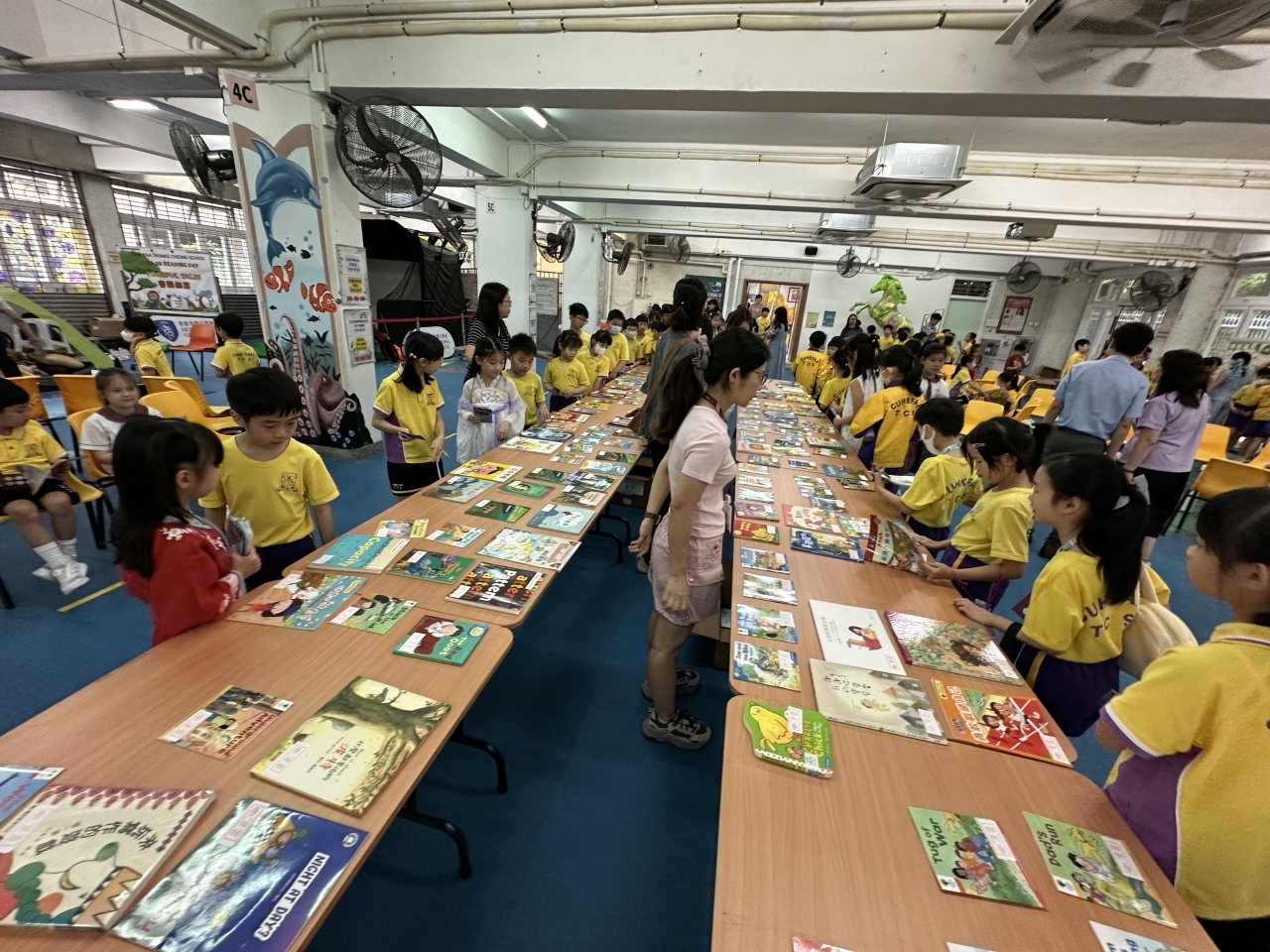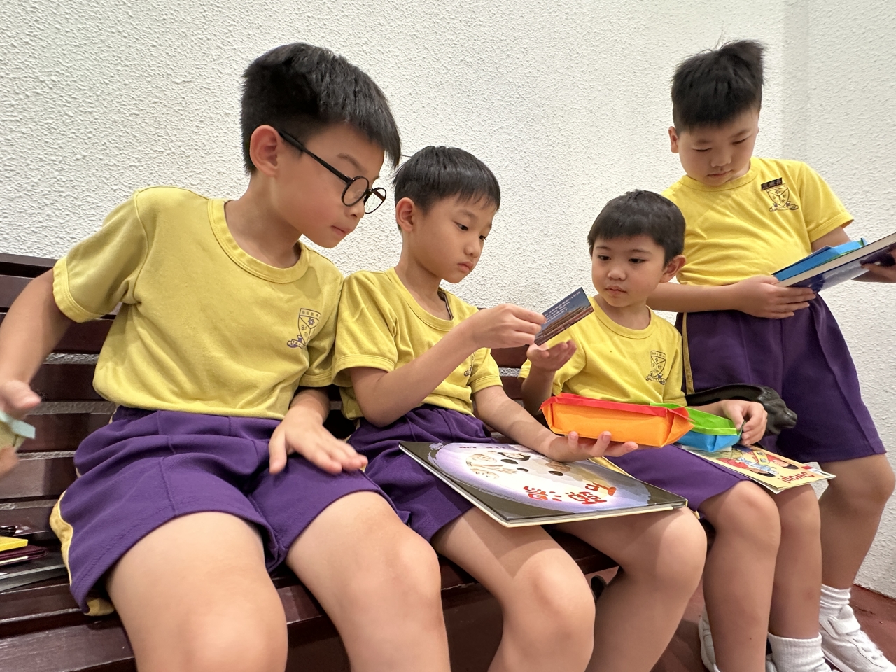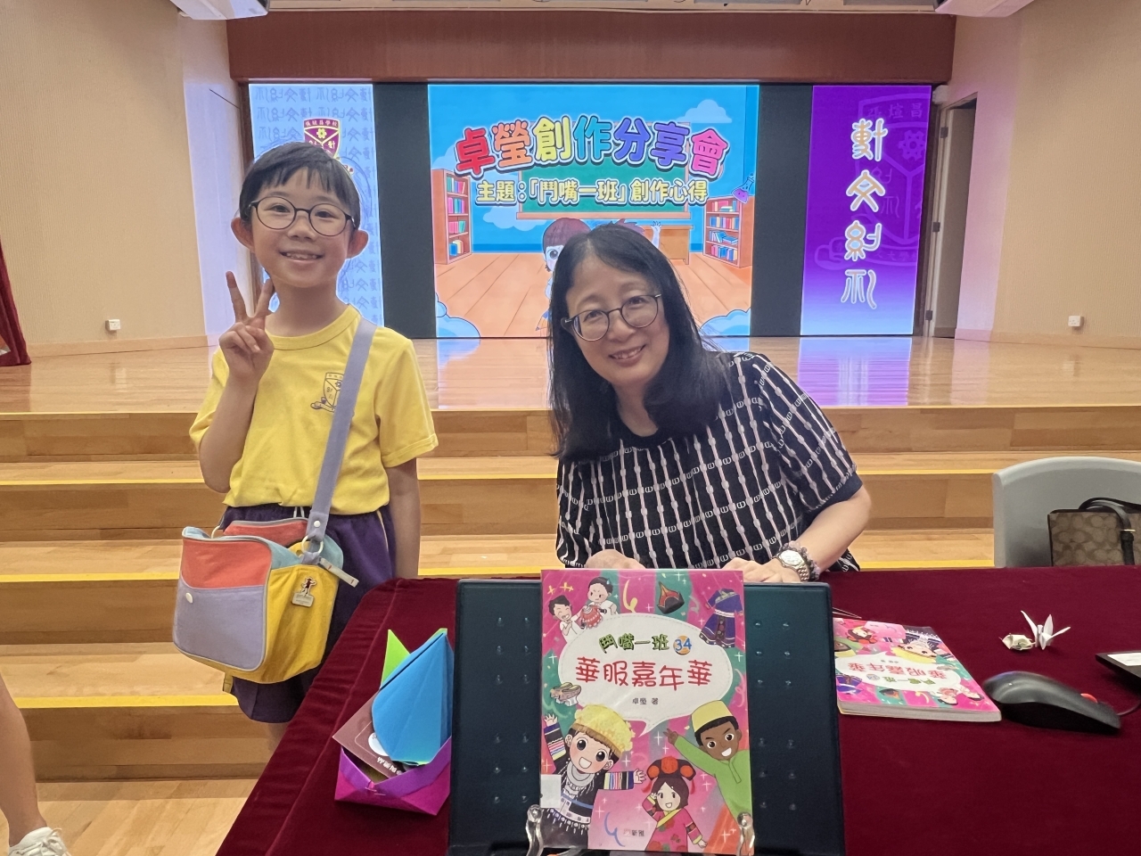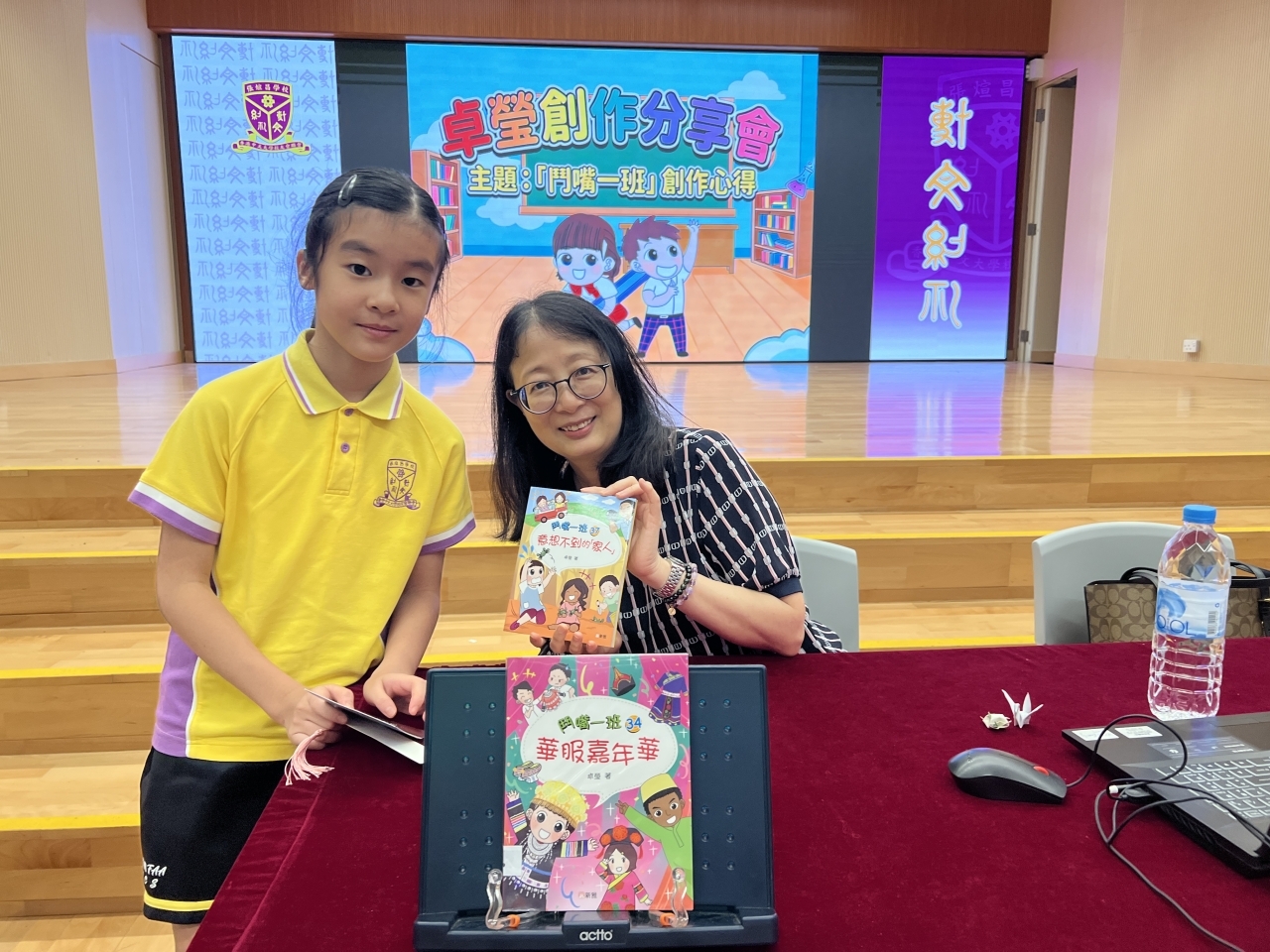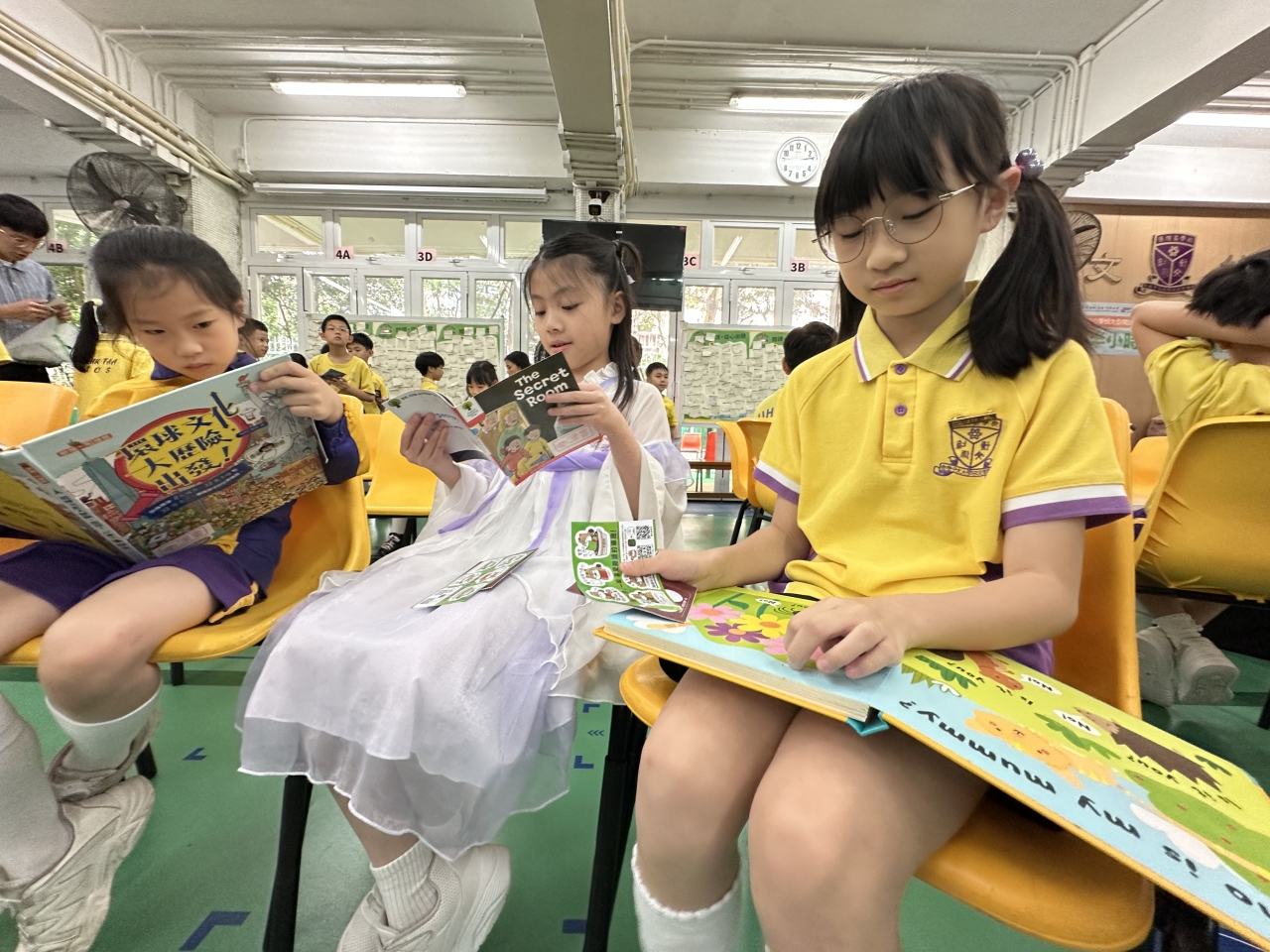 2026-04-28 閱讀半小時 同學們在早讀時段專心閱讀半小時,隨後在便利貼上寫下閱讀感想,再到雨操場張貼,和同學們分享閱讀的樂趣。 圖書大電視 學生們利用遊戲方式和同學分享書中事物,刺激又好玩。 漂書活動 早前,學校向家長們募捐圖書進行漂書活動,很多學生都在活動中尋得心頭好,將圖書帶回家閱讀。 攤位遊戲 配合《跟着皇帝遊故宮》的主題,學校準備了不同種類的攤位遊戲供學生們體驗,既有不同科目的遊戲,也有摺紙活動,活動多元化,學生們也玩得盡興。 閱讀講座 高年級邀請了《鬥嘴一班》的作者卓瑩姐姐到校為學生們分享創作心得,學生們聽得津津有味,講座後更設有作者簽書活動。低年級則邀請了新雅姐姐跟學生們分享《跟着皇帝遊故宮》的故事。