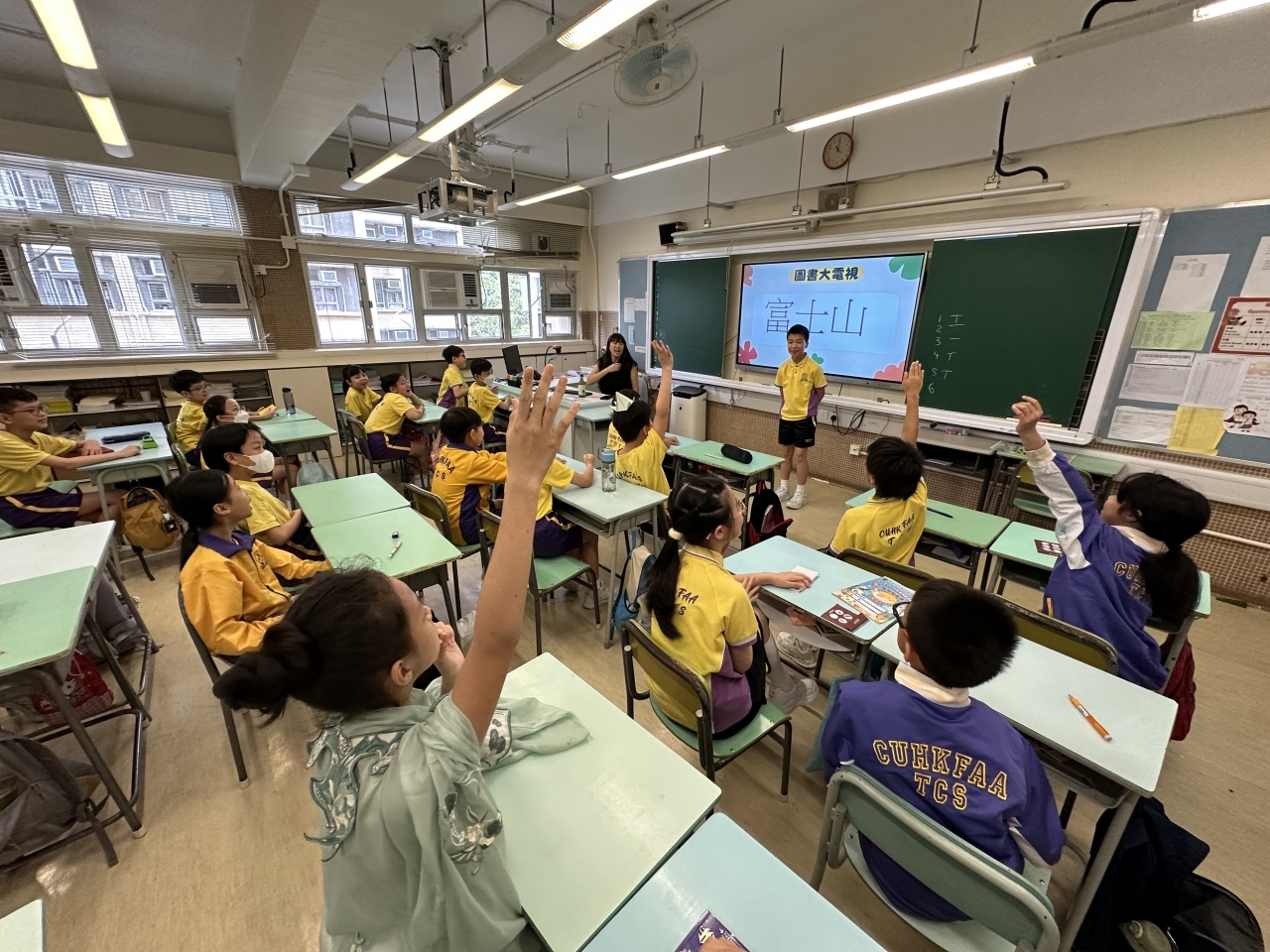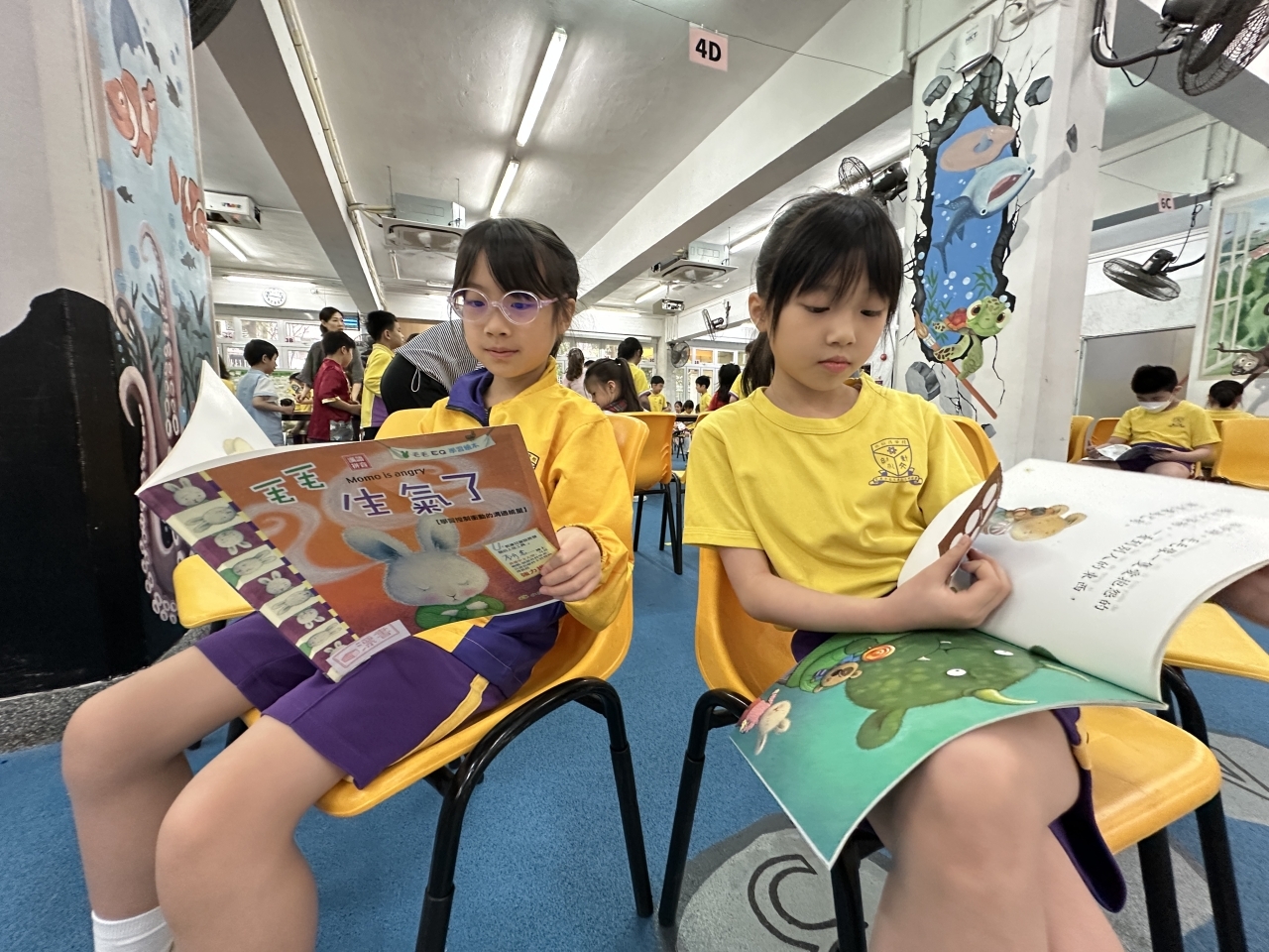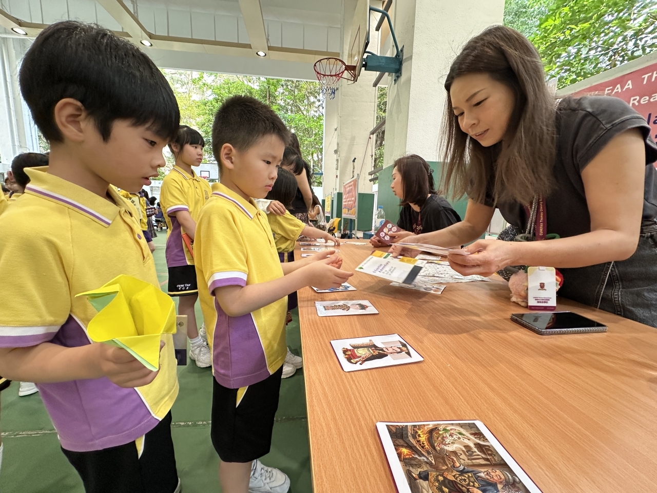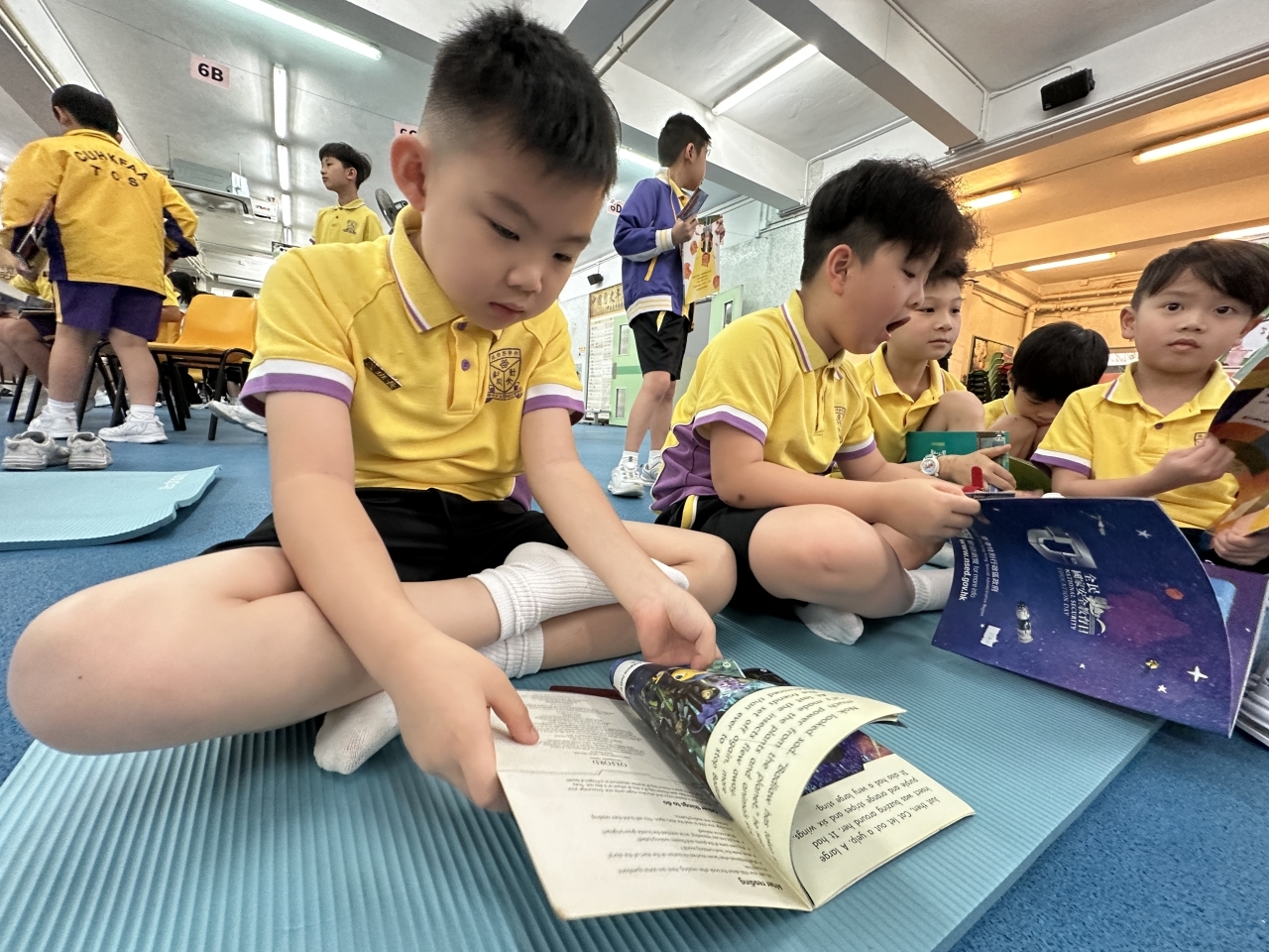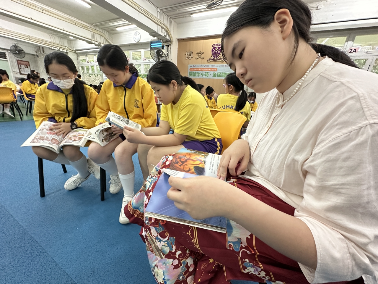 2026-04-28 閱讀半小時 同學們在早讀時段專心閱讀半小時,隨後在便利貼上寫下閱讀感想,再到雨操場張貼,和同學們分享閱讀的樂趣。 圖書大電視 學生們利用遊戲方式和同學分享書中事物,刺激又好玩。 漂書活動 早前,學校向家長們募捐圖書進行漂書活動,很多學生都在活動中尋得心頭好,將圖書帶回家閱讀。 攤位遊戲 配合《跟着皇帝遊故宮》的主題,學校準備了不同種類的攤位遊戲供學生們體驗,既有不同科目的遊戲,也有摺紙活動,活動多元化,學生們也玩得盡興。 閱讀講座 高年級邀請了《鬥嘴一班》的作者卓瑩姐姐到校為學生們分享創作心得,學生們聽得津津有味,講座後更設有作者簽書活動。低年級則邀請了新雅姐姐跟學生們分享《跟着皇帝遊故宮》的故事。